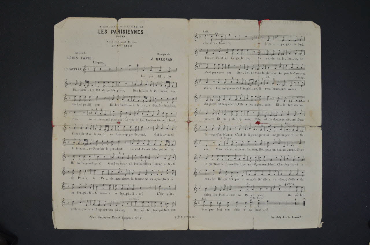Les inscriptions renseignent le titre de la chanson, le nom des auteurs, de l'artiste et de l'éditeur. A l'intérieur, partitions et paroles de la chanson. Au dos, liste d?autres partitions publiées par l?éditeur.Décor