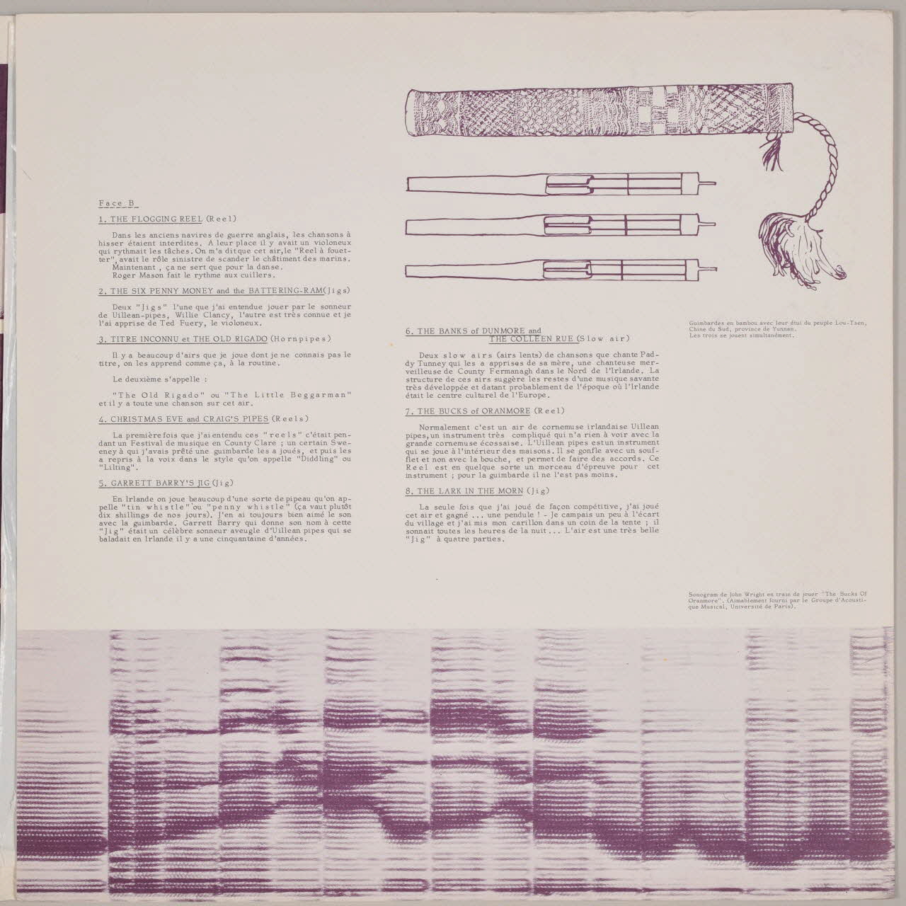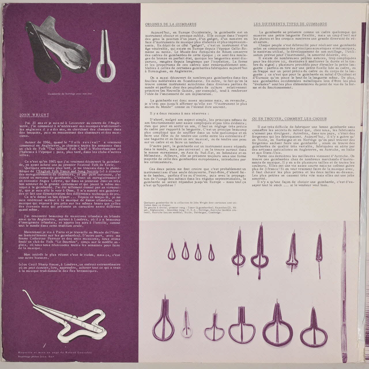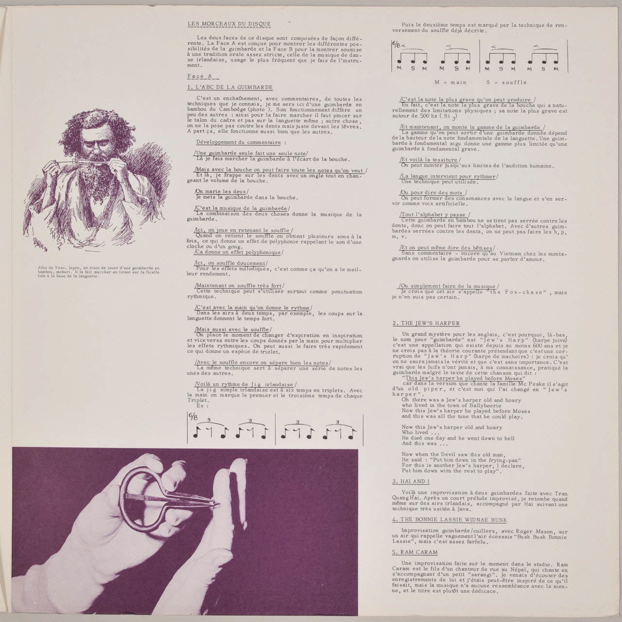 Des inscriptions sur les deux faces de la pochette et sur l'étiquette rouge du disque renseignent les titres et les exécutants de l'album. Au verso et à l'intérieur de la pochette, des textes explicatifs sur la guimbarde ou les différentes chansons interprétées accompagnées de dessins ou de photographies.Décor