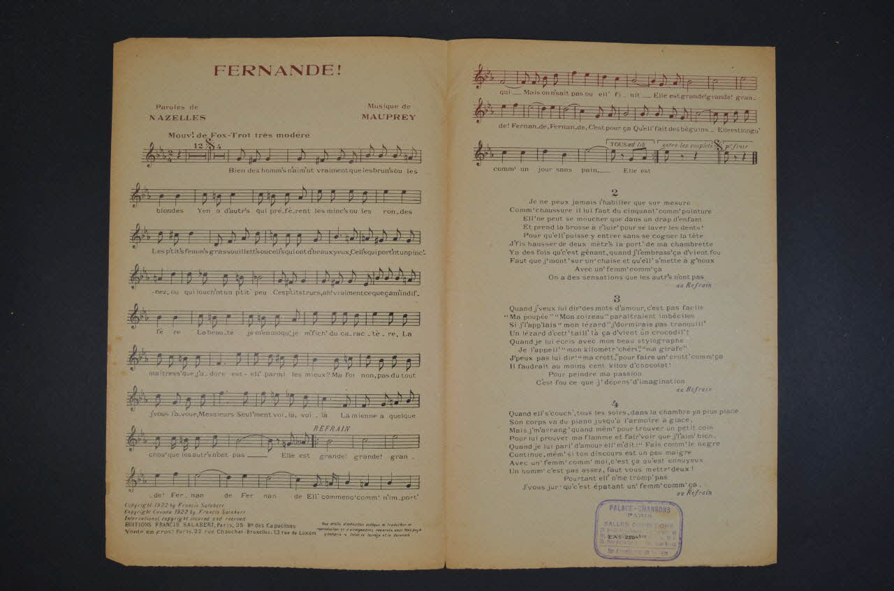 Les inscriptions renseignent le titre de la chanson, le nom des auteurs, de l'artiste et de l'éditeur. A l'intérieur, partitions et paroles de la chanson. Au dos, liste d?autres partitions publiées par l?éditeur.Décor