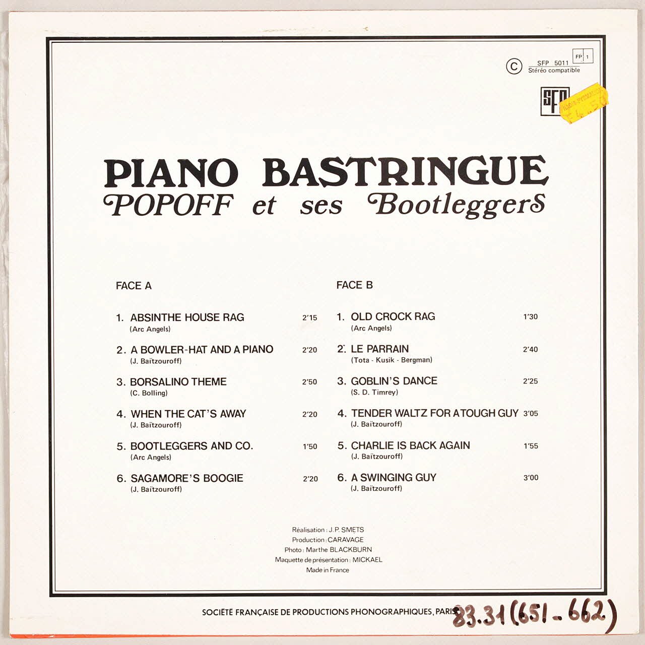 disque 33 tours, When the cat's away, Goblin's dance, Absinthe House Rag, Bootleggers and Co, Old crok rag, Tender waltz for a tough guy, Piano Bastringue, A swinging guy, Sagamore's Boogie, A bowler hat and a piano, Charlie is back again, Le parrain, Borsalino time