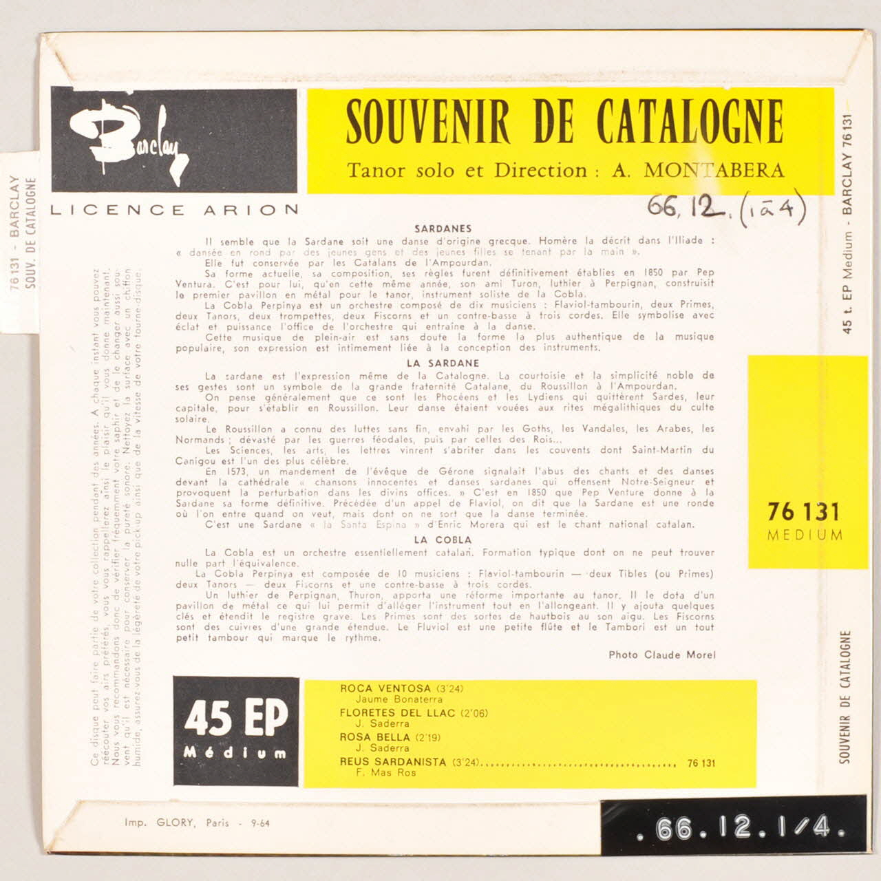 disque 45 tours, Reus sardanista, Floretes del llac, Roca ventosa, Souvenir de Catalogne, Rosa Bella