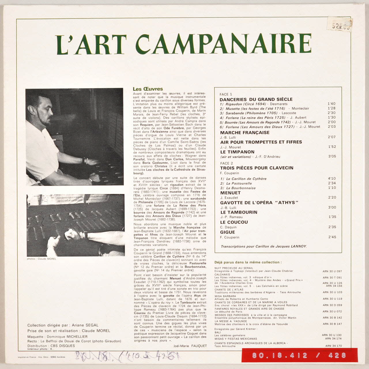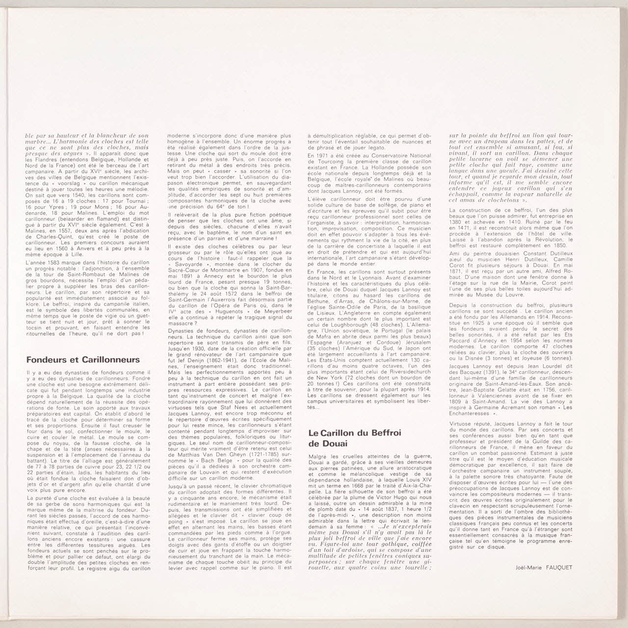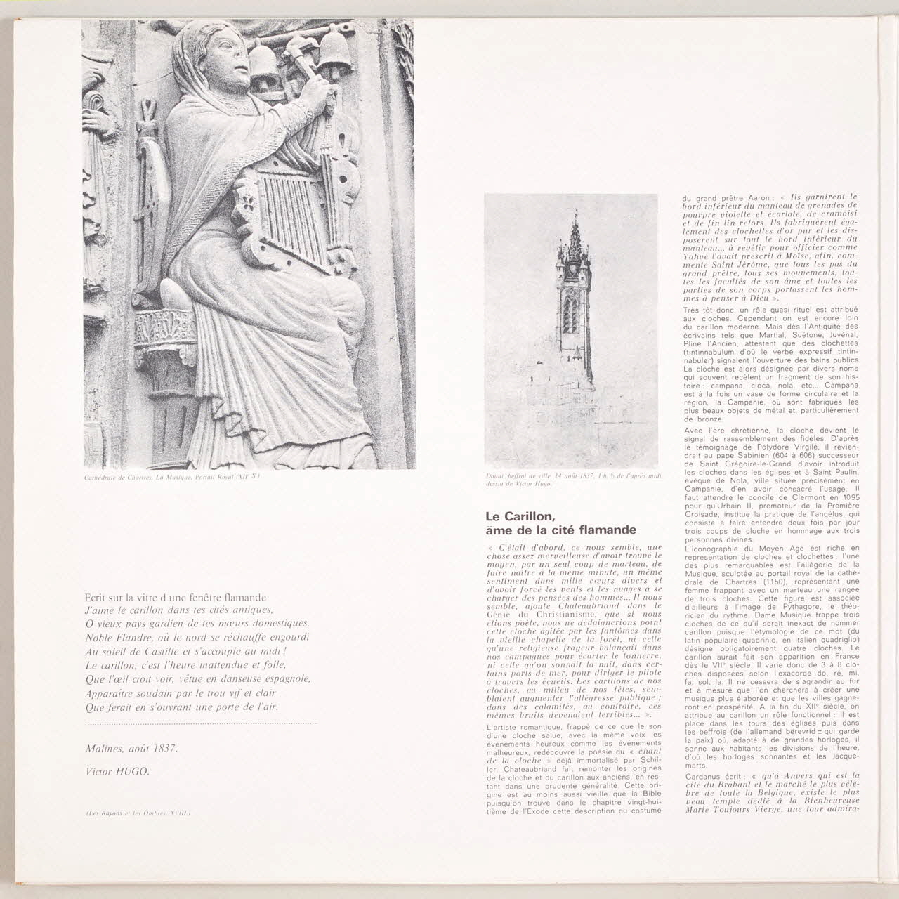 Au verso, une photographie du musicien jouant accompagné d'un texte explicatif. A l'intérieur de la pochette, des explications sur les carillons illustrées de photographies ou de dessins. Des inscriptions sur les deux faces de la pochette et sur l'étiquette orange du disque renseignent les titres et les exécutants de l'album.Décor