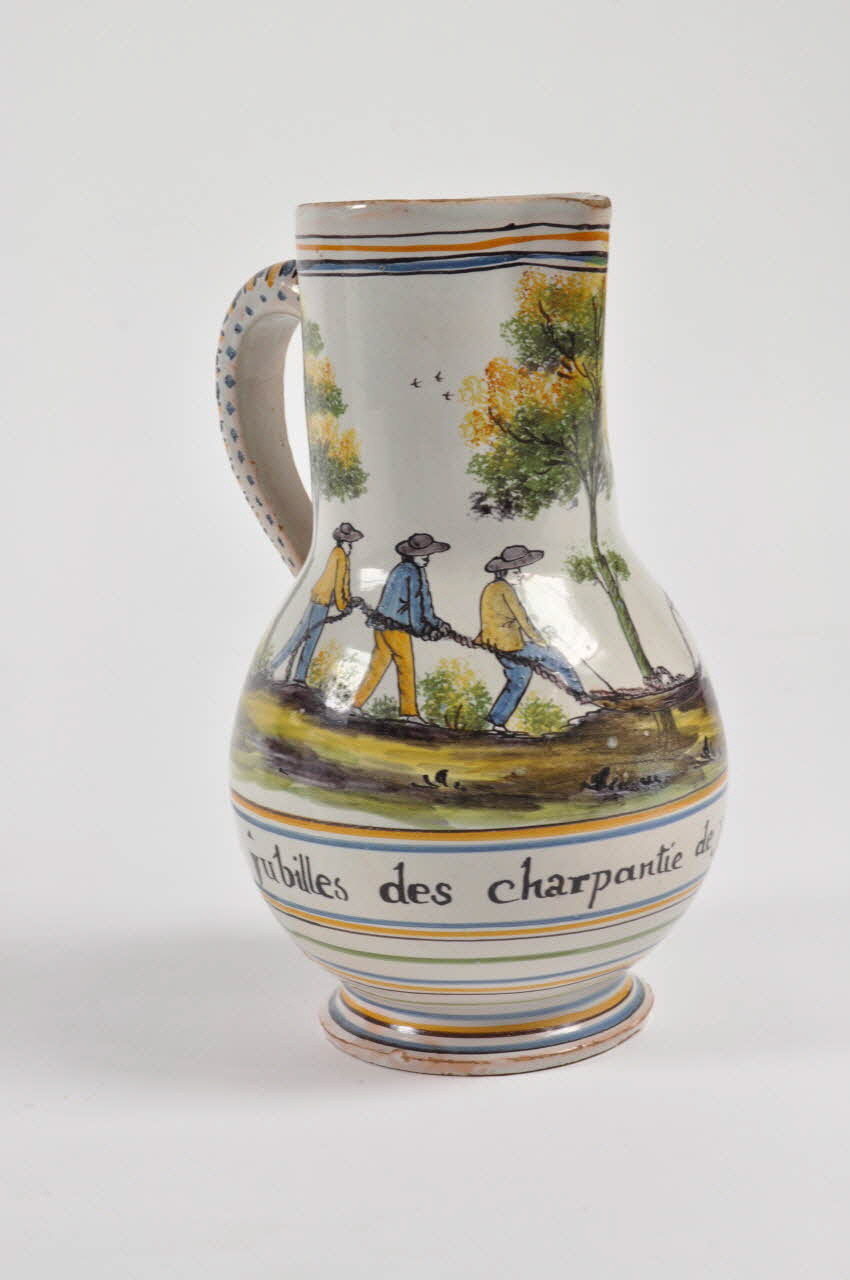 Sur plan circulaire à fond plat avec panse globulaire avec anse latérale verticale, et col long à lèvre arrondie et à bec verseur. Décor avec dans un paysage, six charpentiers au travail avec une inscription entre des bandes de couleur bleues et orange. Sur la anse alternance de bandes orange et bleues.Décor