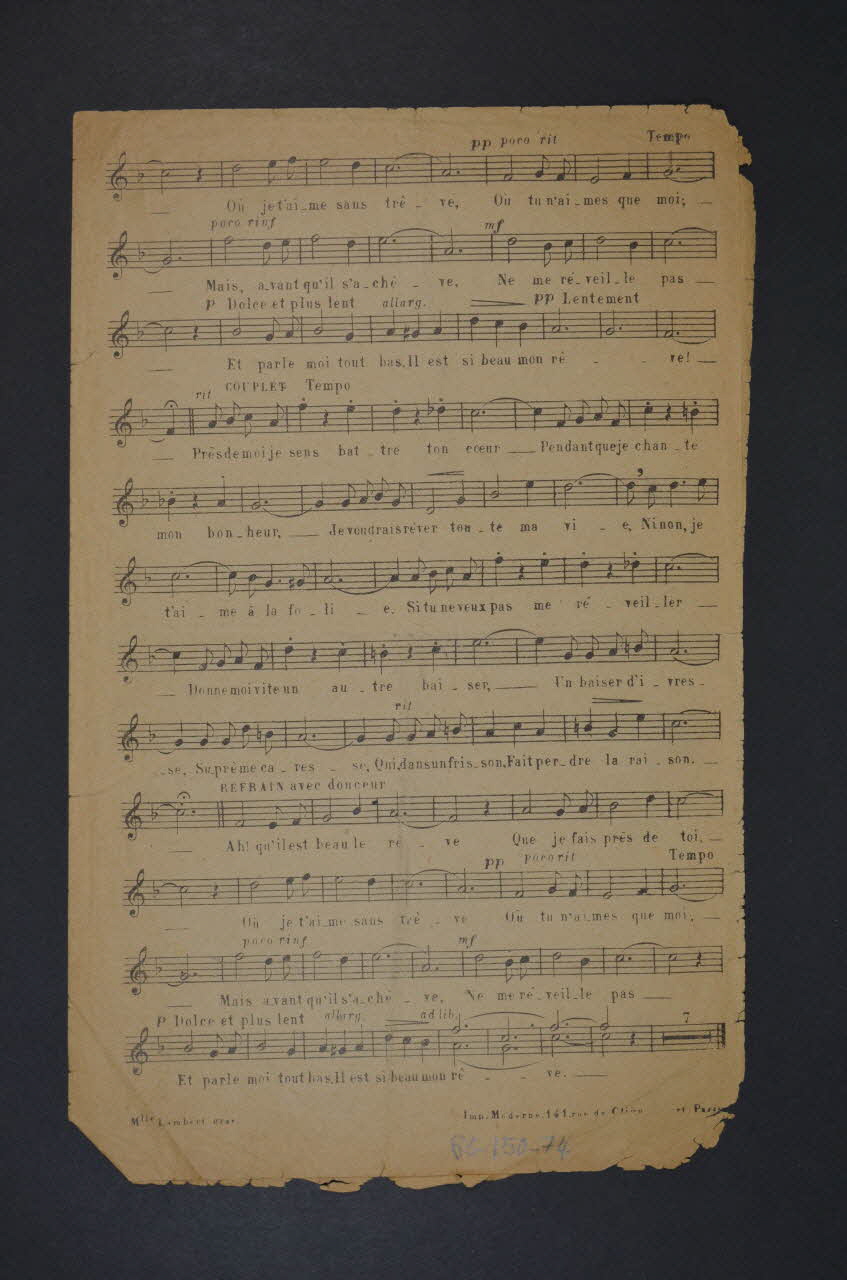 Les inscriptions renseignent le titre de la chanson, le nom des auteurs, de l'artiste et de l'éditeur. L'intérieur est laissé vierge. Au dos, la suite de la partition.Matériaux et techniques
