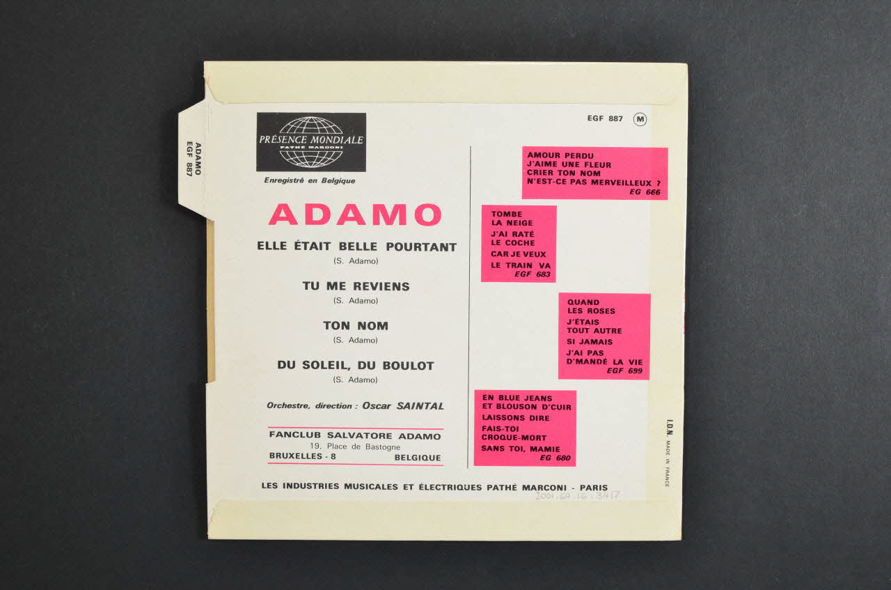 Cette pochette de disque en papier cartonné présente une forme carrée. La face avant, plastifiée, est illustrée en partie inférieure d'une photographie couleur du chanteur, en buste. Il porte une chemise et une casquette bleues, un coquelicot entre les dents, et se présente devant un fond de verdure. Son nom est inscrit en bleu sur bandeau supérieur noir, avec les titres en blanc.