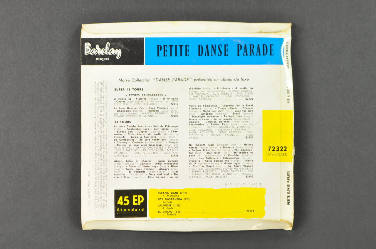 Le recto présente une photographie colorée de danseurs. Sur un bandeua blanc, figurent le nom du disque en bleu et noir, les titres des chansons en noir, et le logo de l'éditeur en noir et blanc.