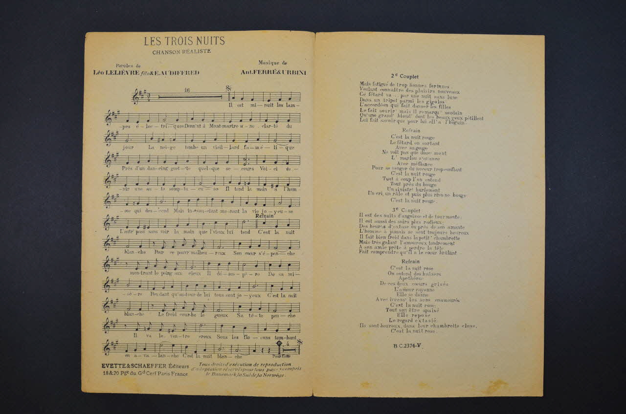 papier imprimé / Feuillet rectangulaire en papier industriel imprimé. Le feuillet contient la partition et les paroles de la chanson. Au dos, publicité pour l'éditeur.Décor