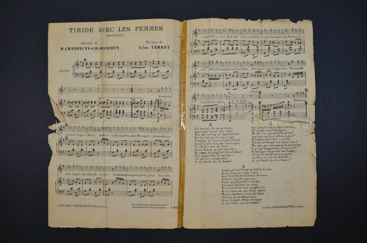 Feuillet rectangulaire en papier industriel imprimé. Le feuillet contient la partition et les paroles de la chanson. Au dos, publicité pour l'éditeur. Le feuillet porte une ancienne réparation faite avec un timbre "Ligue antiallemande"Décor