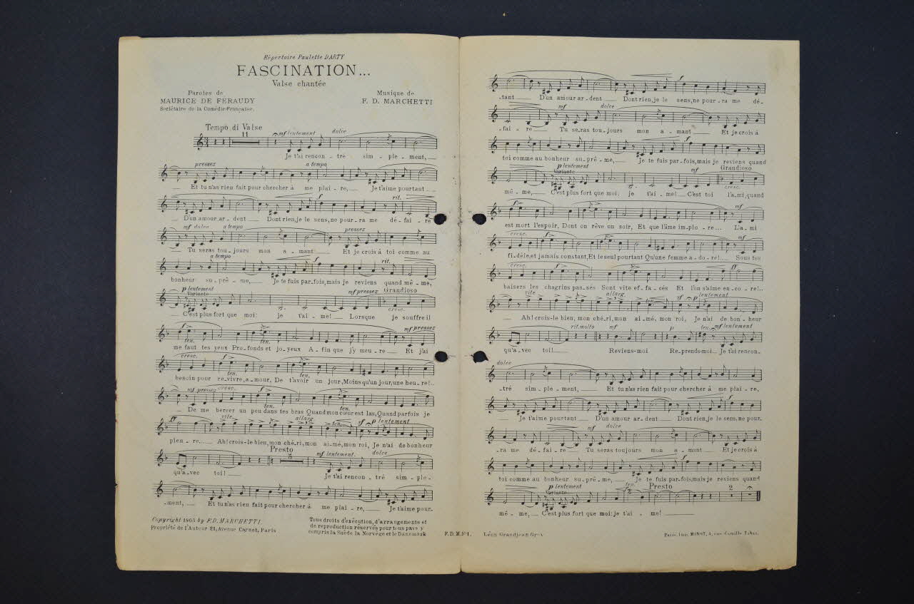 Feuillet rectangulaire en papier industriel imprimé. Le feuillet contient la partition et les paroles de la chanson. Au dos, publicité pour l'éditeur.Matériaux et techniques