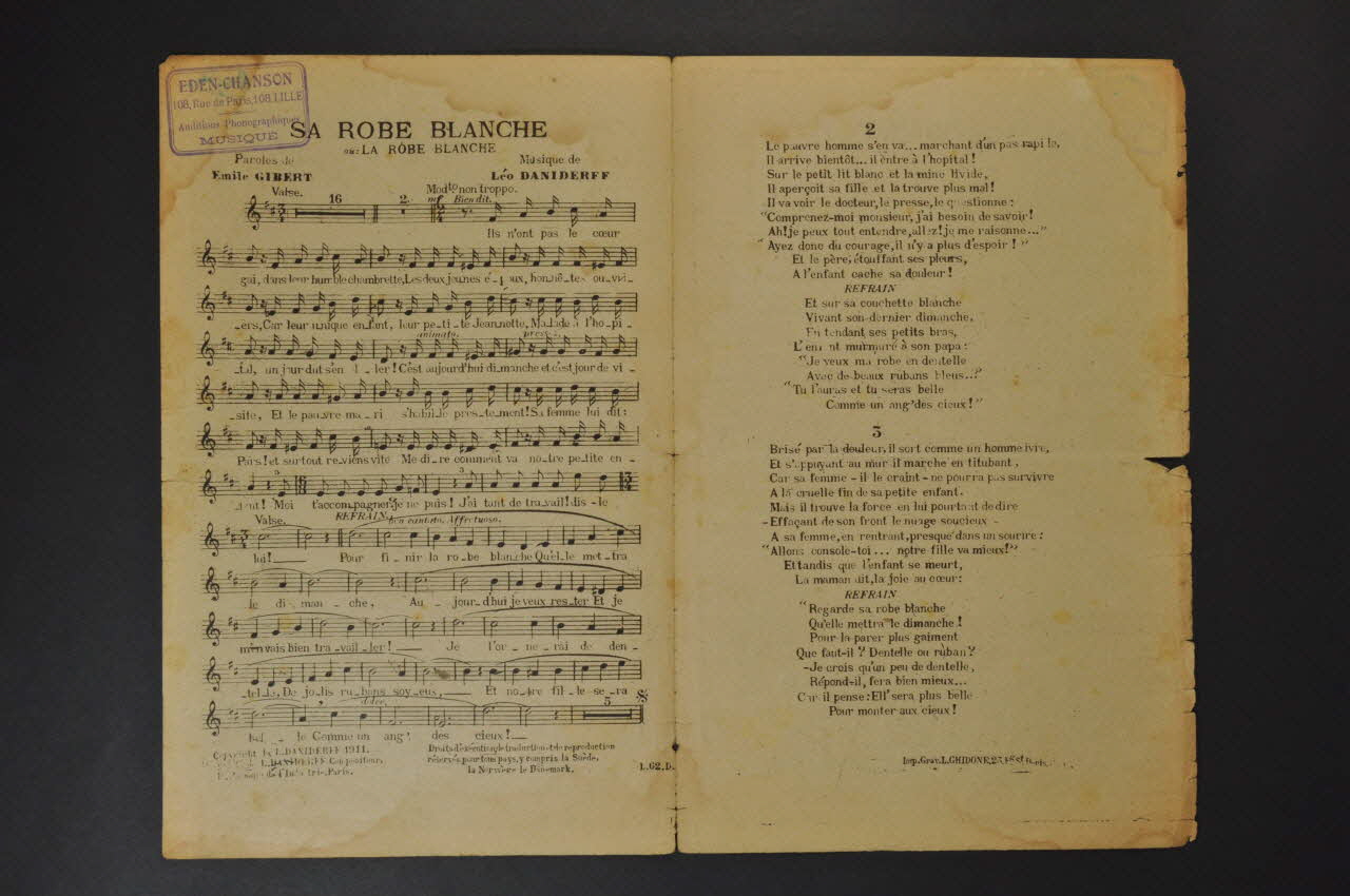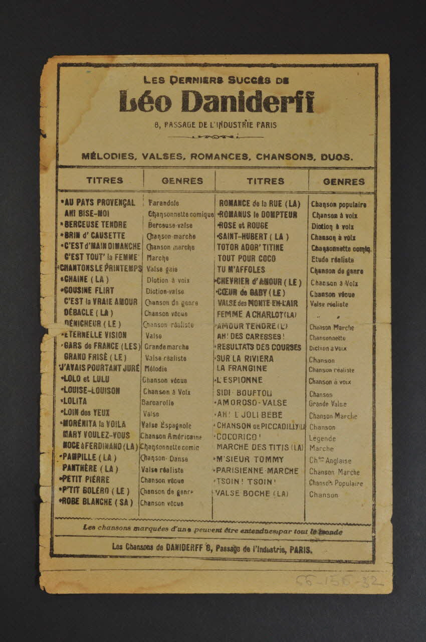 Les inscriptions renseignent le titre de la chanson, le nom des auteurs, de l'artiste et de l'éditeur. A l'intérieur, partitions et paroles de la chanson. Au dos, liste d?autres partitions publiées par l?éditeur.Décor