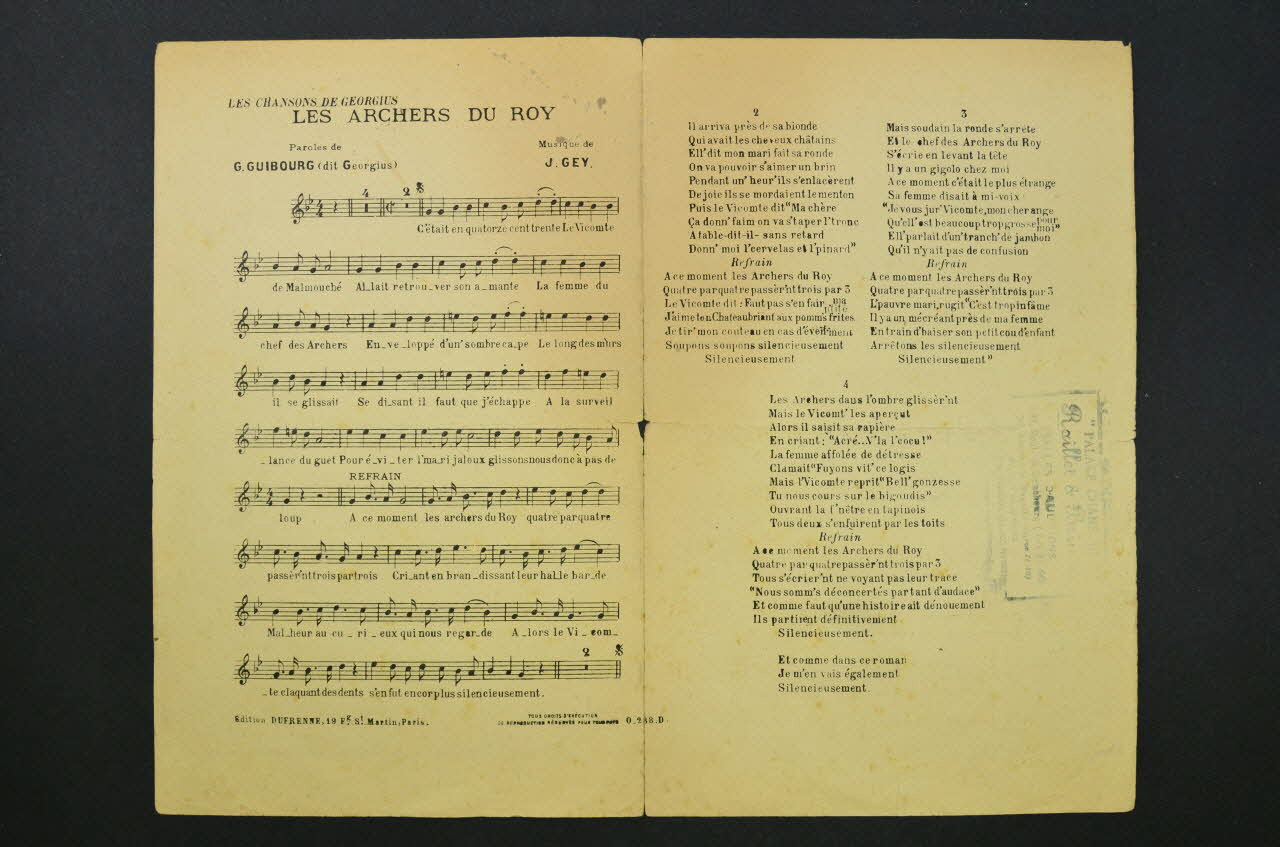La couverture du feuillet présente une scène de rue médiévale : les archers du roi, emmenés par leur chef, un homme ventripotent au nez rougi, font leur ronde dans les rues de la ville. L'époux trompé découvre sa femme et le vicomte Malmouché à la fenêtre de sa chambre. Les inscriptions renseignent le titre de la chanson, le nom des auteurs, de l'artiste et de l'éditeur. A l'intérieur, partition et paroles de la chanson. Au dos, liste d'autres partitions publiées par l'éditeur.Inscriptions