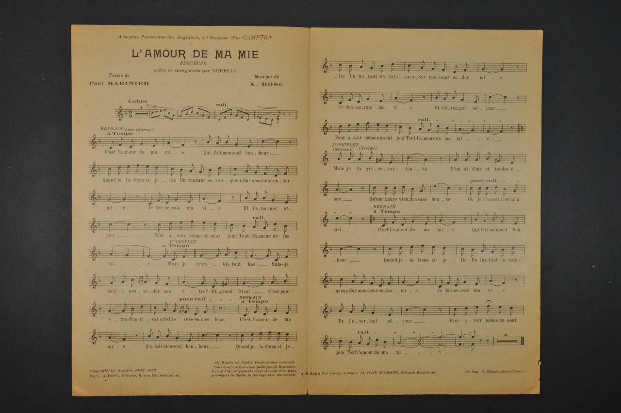 Les inscriptions renseignent le titre de la chanson, le nom des auteurs, de l'artiste et de l'éditeur. A l'intérieur, partitions et paroles de la chanson. Au dos, liste d?autres partitions publiées par l?éditeur.Décor