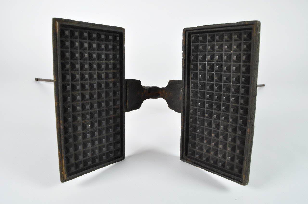 Fer forgé, fonte moulée / Deux branches de métal, placées en x de manière à se mouvoir autour d'un axe, terminées par deux plaques métalliques, rectangulaires munies de quadrillages de pyramides tronquées sur les faces intérieures.Matériaux et techniques
