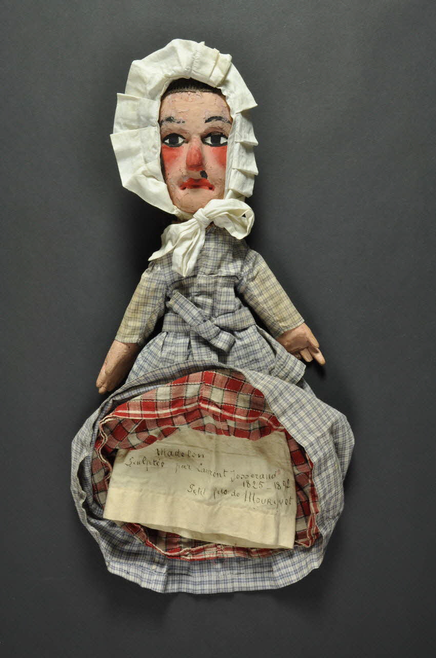 Cette marionnette à gaine en bois sculpté et peint représente Madelon; sa tête et ses mains sont en bois sculpté, la gaine est en toile; Madelon porte un jupon à carreaux rouges et blancs, une robe vichy à carreaux bleus et blanc et un bonnet blanc; sa chevelure est faite à partir de véritables cheveux; peinture à la colle.Décor