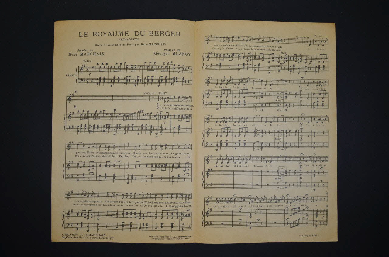 Feuillet rectangulaire en papier industriel, imprimé à l'encre noire. A l'intérieur, paroles et partitions de la chanson. Tyrolienne.