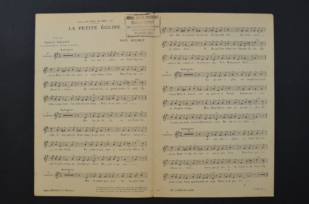 Feuillet rectangulaire en papier industriel, imprimé à l?encre brune (sauf l?intérieur à l?encre noire). La couverture du feuillet présente le dessin d'un clocher, une croix au premier plan.