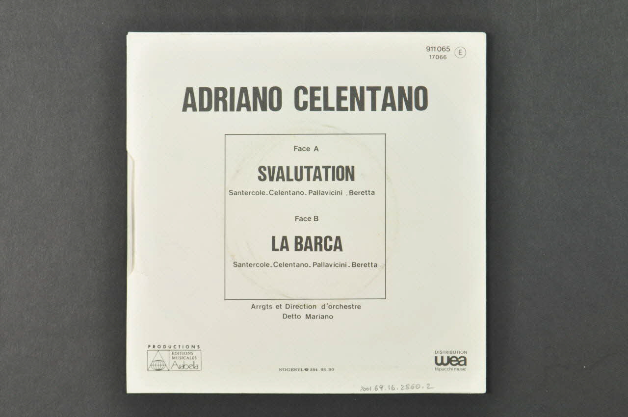 Le disque rond et noir comporte une perforation circulaire au centre. Une étiquette grise contenant le nom du chanteur, le titre des chansons, le logo de l'éditeur ainsi que d'autres inscriptions en noir est collée au centre.