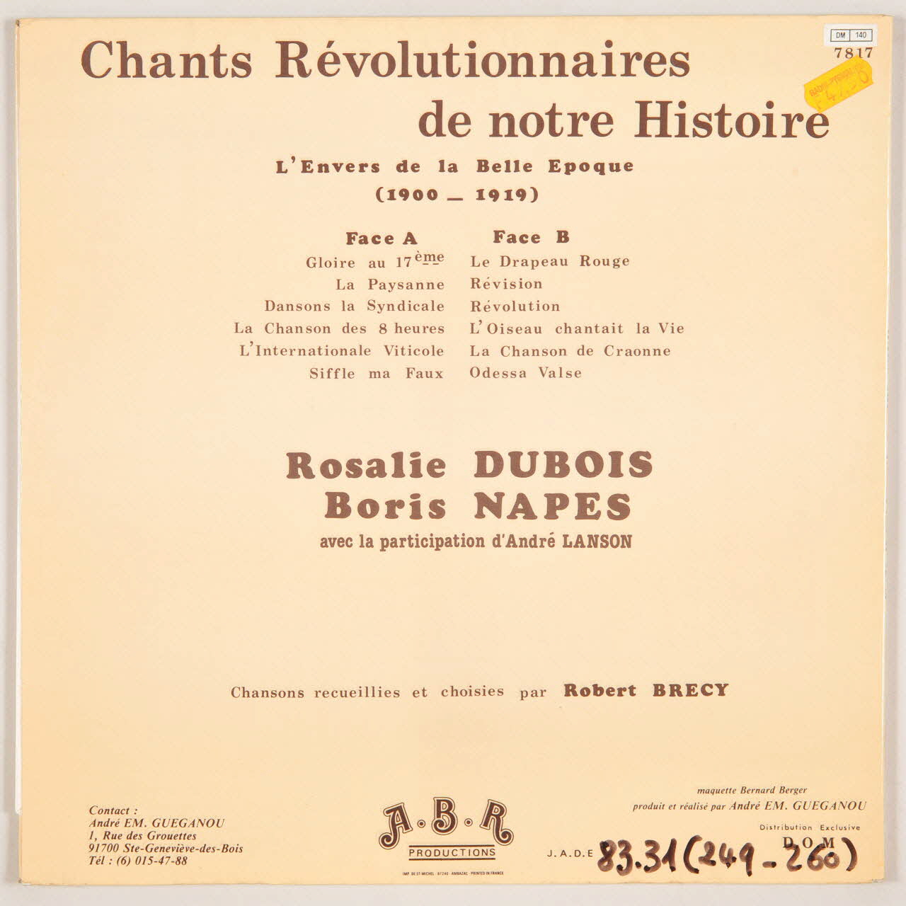 disque 33 tours, La chanson des huit heures, Révolution, Gloire au 17ème, L'Internationale viticole, Le drapeau rouge, L'oiseau chantait la vie, Chants révolutionnaires de notre histoire, Odessa, Siffle ma faux, La paysanne, La chanson de Craonne, Révision, Dansons la syndicale
