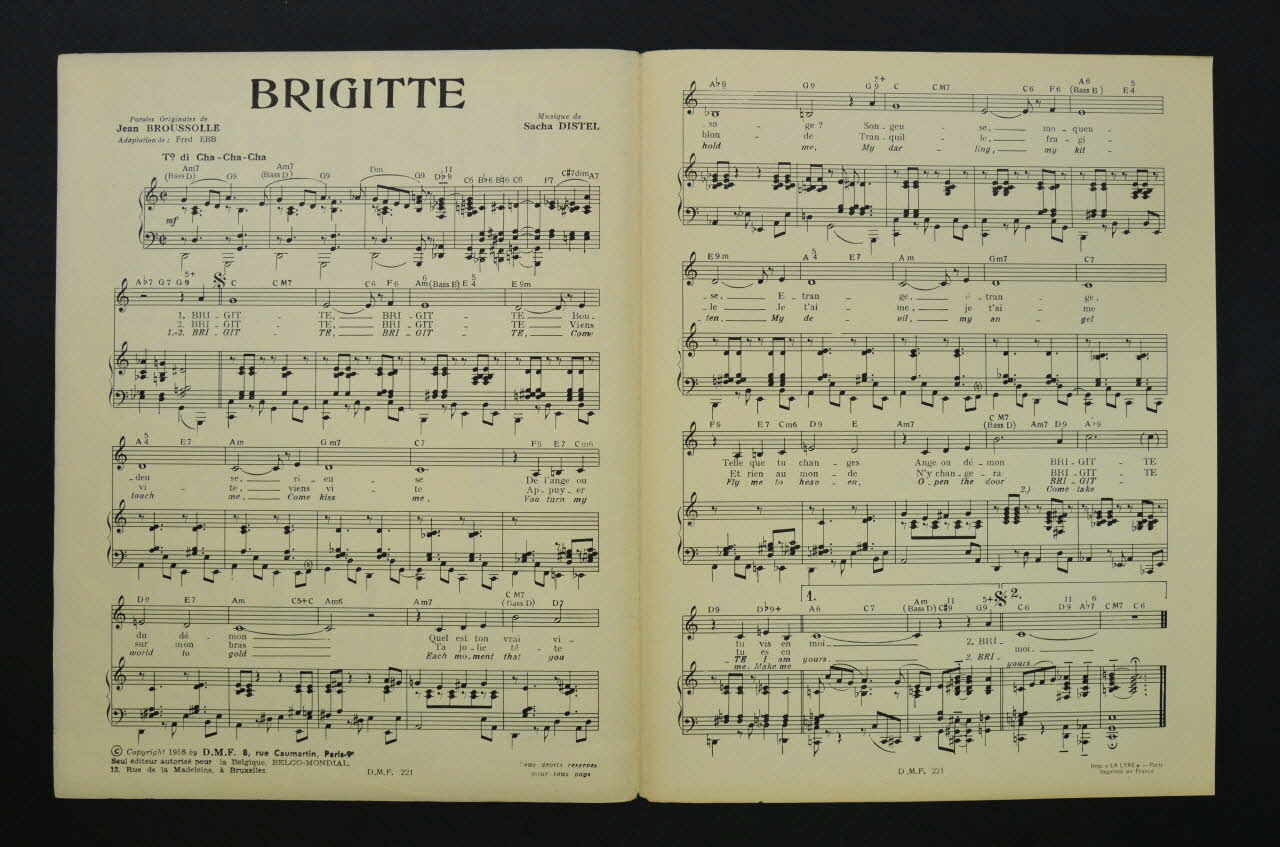 Sur le centre de la couverture, le portrait photographique de Sacha Distel, les bras croisés. Les inscriptions renseignent le titre de la chanson, le nom des auteurs, de l'artiste et de l'éditeur. A l'intérieur, partition et paroles de la chanson. Au dos, tableau pratique pour apprendre la guitare avec commentaires et schémas des accords.Matériaux et techniques