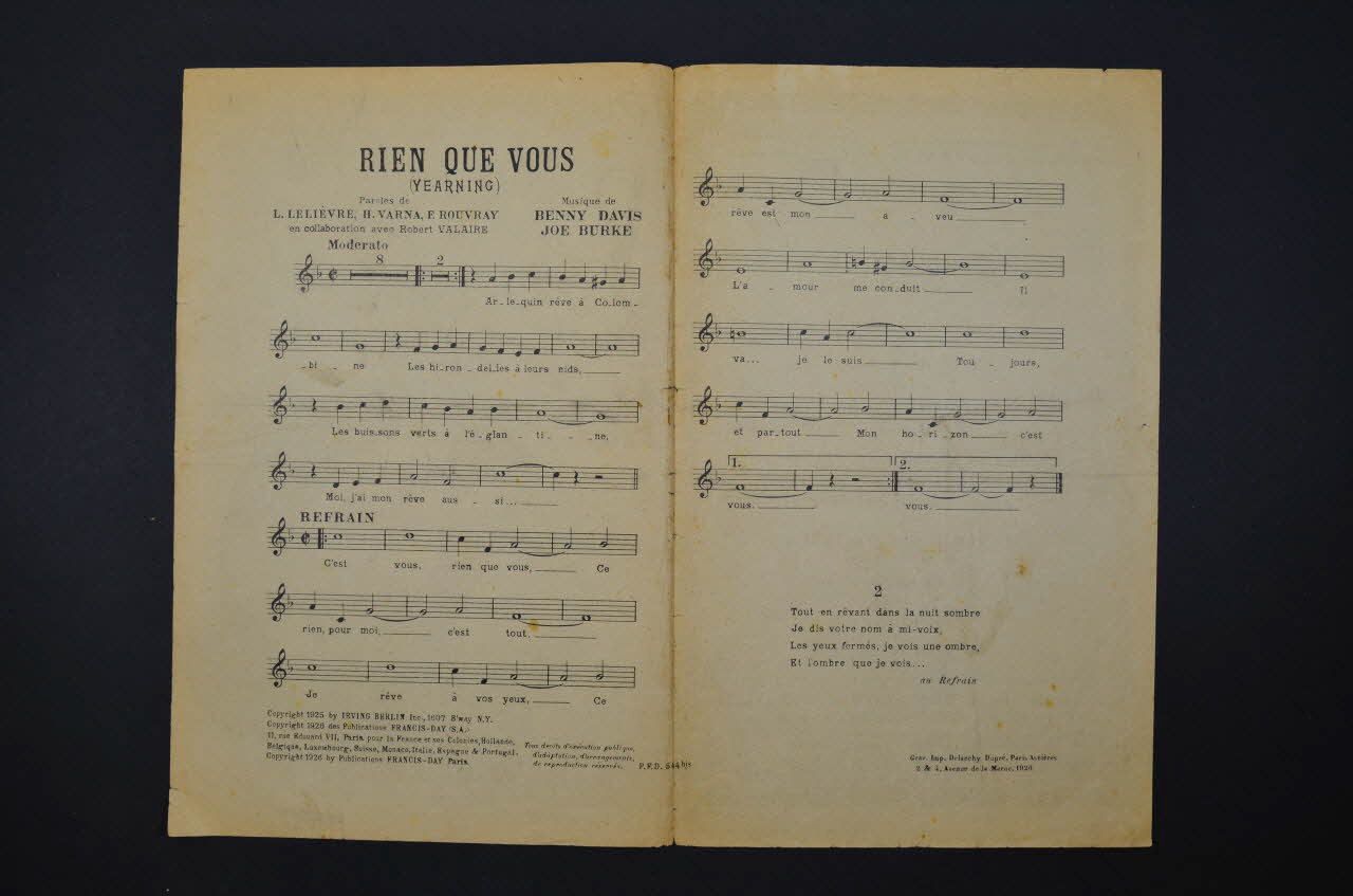 Sur la couverture, la représentation stylisée d'un couple s'embrassant, dans un encadrement circulaire ; dans l'angle inférieur droit, le portrait photographique en médaillon d'un artiste ou auteur. Les inscriptions renseignent le titre de la chanson, le nom des auteurs, des artistes et de l'éditeur. A l'intérieur, partition et paroles de la chanson. Au dos, liste d'autres partitions publiées par l'éditeur.Décor