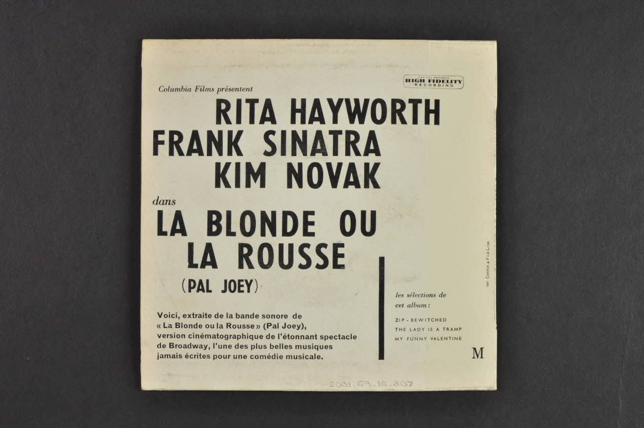 Le recto comporte le titre du film et le logo de l'éditeur en noir et rouge à droite. A gauche, se trouve une image représentant deux femmes et un homme sur fond blanc. Une des femmes porte une robe de soirée beige, l'homme porte un costume et un chapeau et la deuxième femme porte un justaucorps rouge et un chien dans ses bras. Le verso contient le nom des artistes et le titre des chansons en noir sur fond blanc.Matériaux et techniques