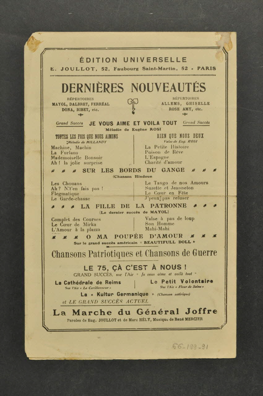 Des inscriptions renseignent le titre, les auteurs, les exécutants et l'éditeur. A l'intérieur, partition et paroles de la chanson. Au dos, liste d'autres partitions publiées par l'éditeur.Décor
