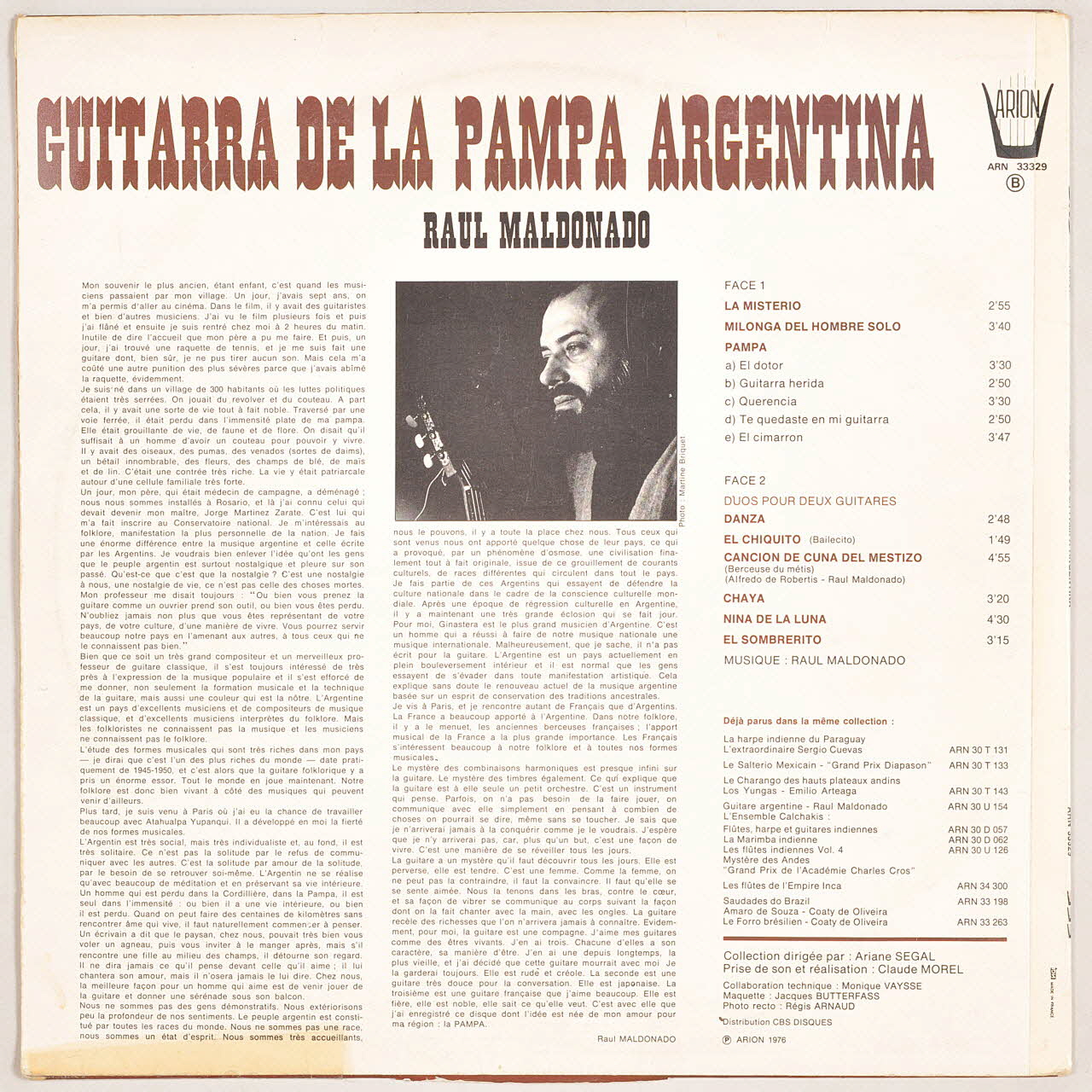 disque 33 tours, El dotor, Danza, La misterio, Guitarra herida, Te quedaste en mi guitarra, Guitarra de la pampa argentina, El chiquito, Chaya, Nina de la luna, Querencia, Milonga del hombre solo, El cimarron, Cancion de cuna del Mestizio, El sombrerito, Pampa