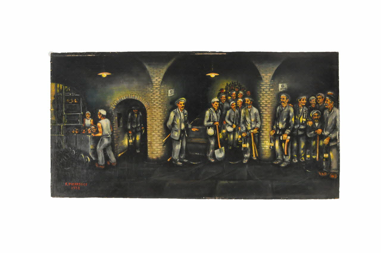 La mine // la remontée // des mineurs (Inscription manuscrite de couleur jaune située au centre et au revers de la peinture.), au centreDécor