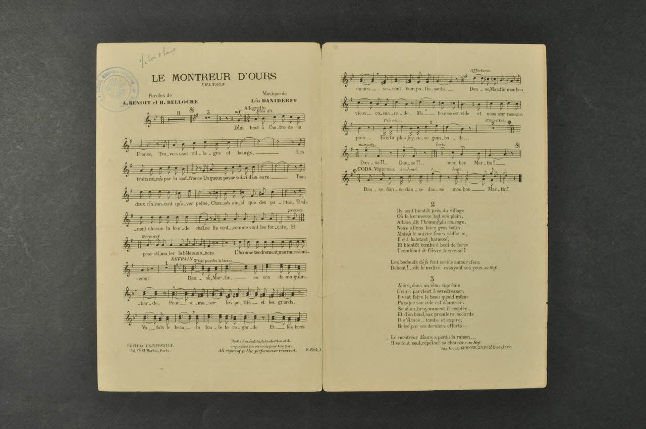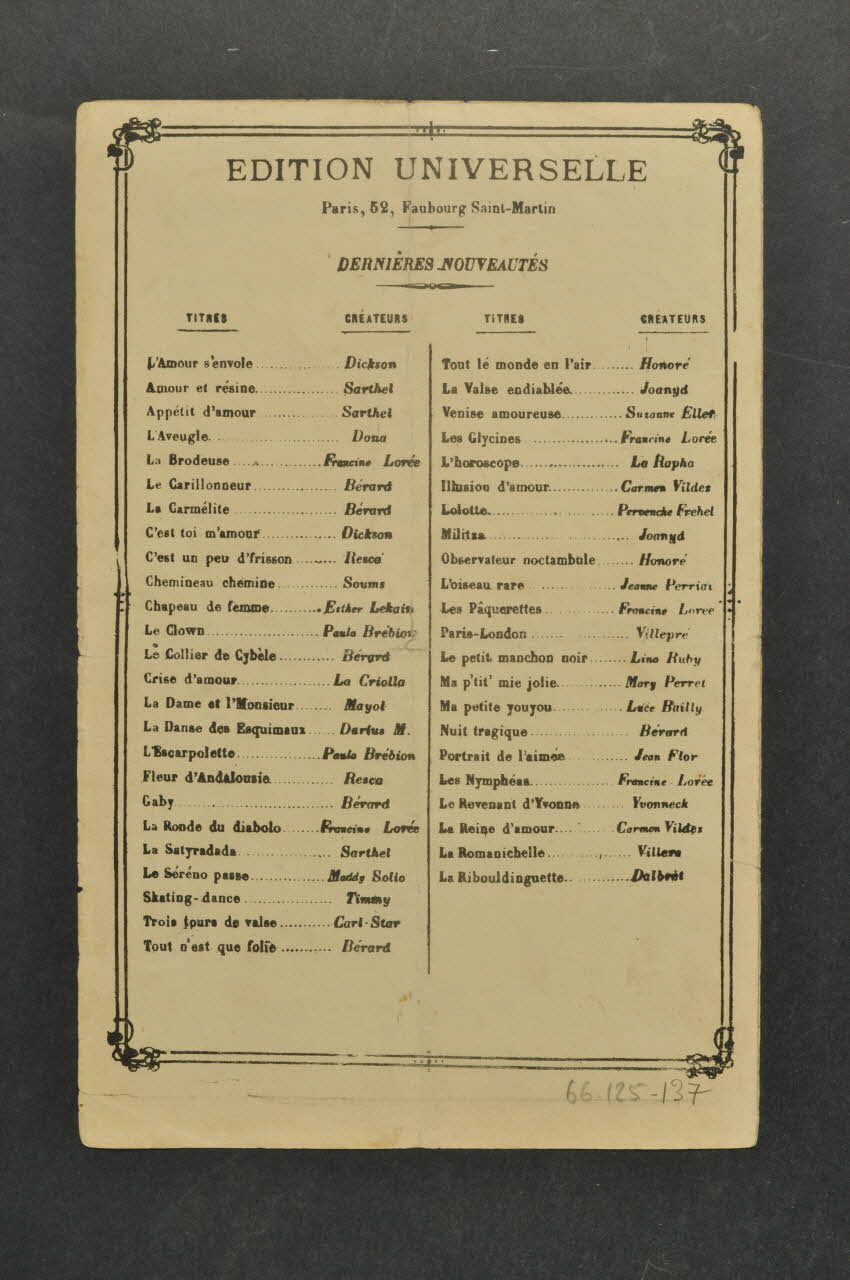 Les inscriptions renseignent le titre de la chanson, le nom des auteurs, de l'artiste et de l'éditeur. A l'intérieur, partitions et paroles de la chanson. Au dos, liste d?autres partitions publiées par l?éditeur.Décor