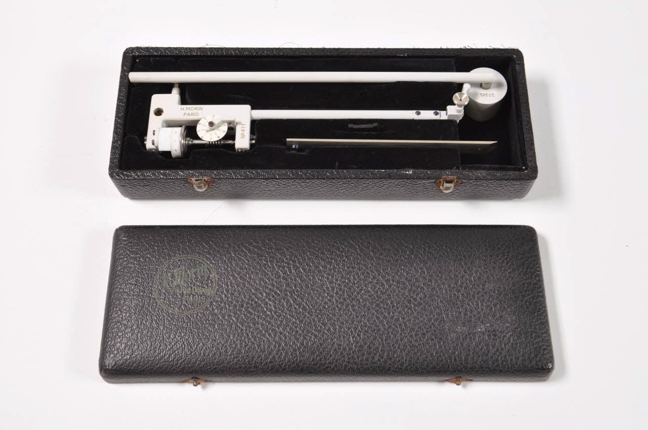 Boîte rectangulaire, plate, en carton recouvert de moleskine noire, contenant un planimètre compensateur, système Coradi. L'intérieur de la boîte présente différents compartiments accueillant les pièces de l'appareil de mesure, garnis de velours noir. La boîte est fermée par un couvercle retenu par deux loquets métalliques.Matériaux et techniques