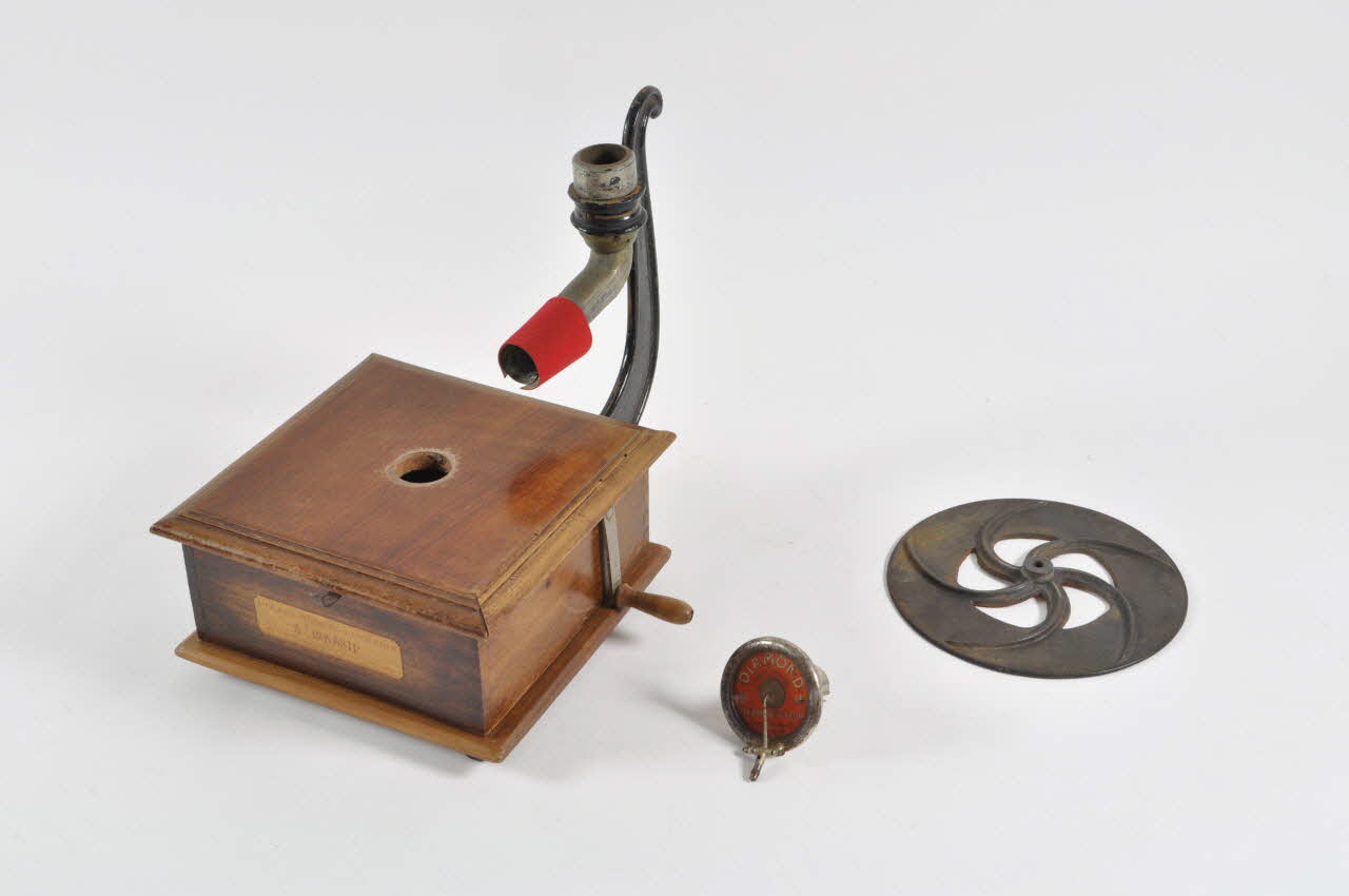 La tête du phonographe (.3) est constituée d'une plaque de métal circulaire (.3.1) avec des bords en reliefs. Sur une face, un papier imprimé à fond rouge, derrière une vitre en plastique transparent. Une fine tige de métal supporte un axe portant l'aiguille protégée d'un cylindre de métal.