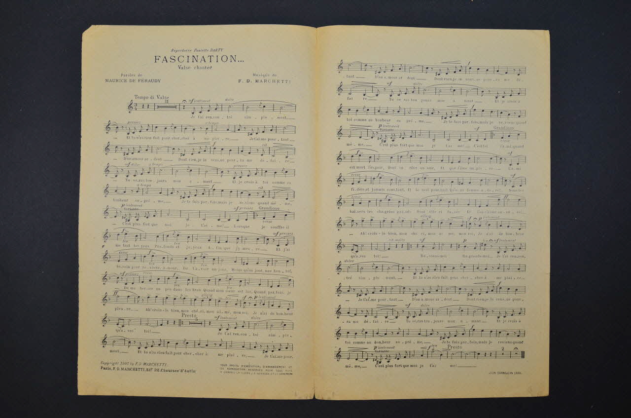 Feuillet rectangulaire en papier industriel imprimé. Le feuillet contient la partition et les paroles de la chanson. Au dos, publicité pour l'éditeur.Décor