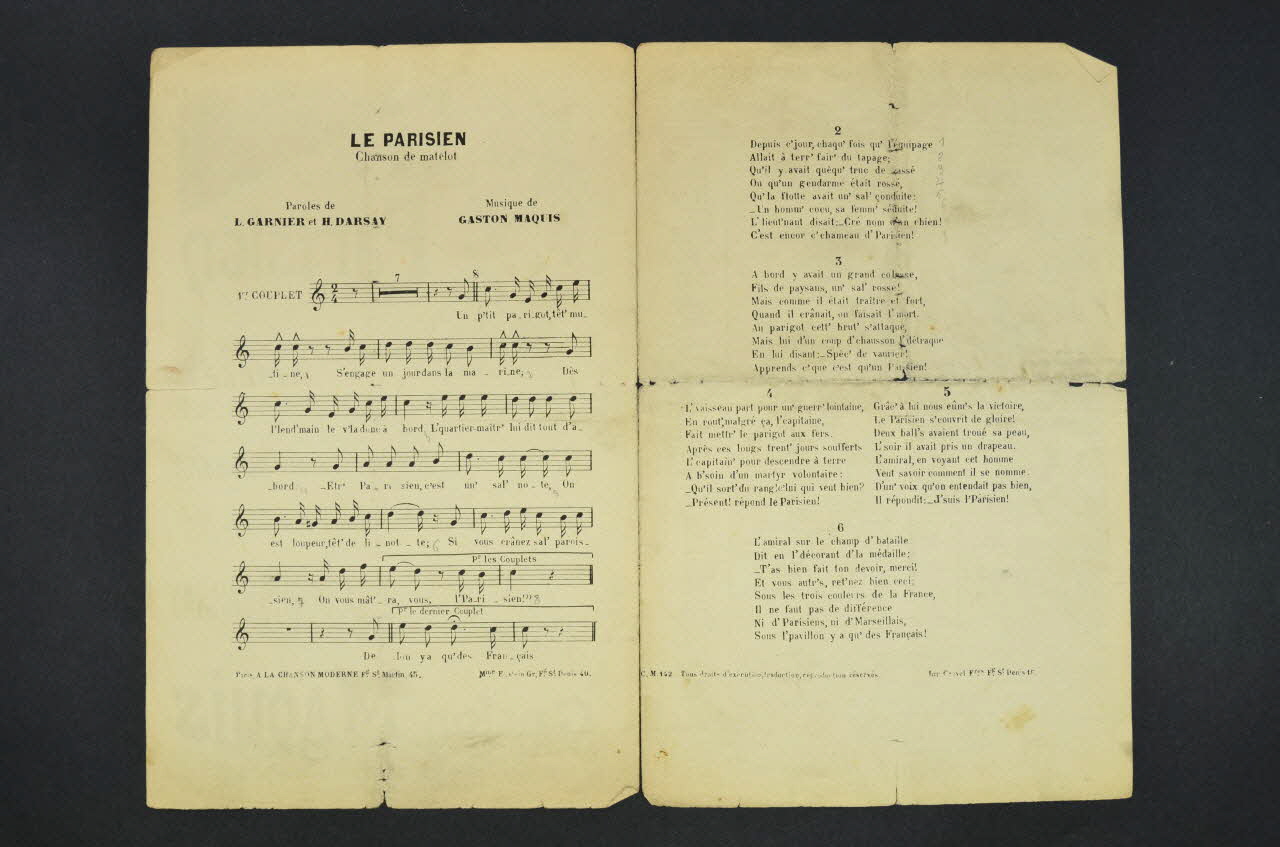 Les inscriptions renseignent le titre de la chanson, le nom des auteurs, de l'artiste et de l'éditeur. A l'intérieur, partition et paroles de la chanson. Au dos, liste d?autres partitions publiées par l?éditeur.Matériaux et techniques