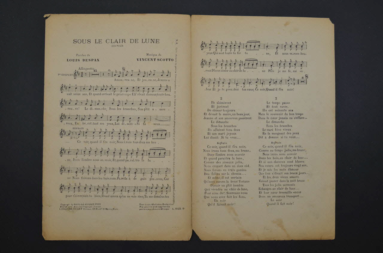 Les inscriptions renseignent le titre de la chanson, le nom des auteurs, de l'artiste et de l'éditeur. A l'intérieur, partition et paroles de la chanson. Au dos, liste d?autres partitions publiées par l?éditeur.Matériaux et techniques
