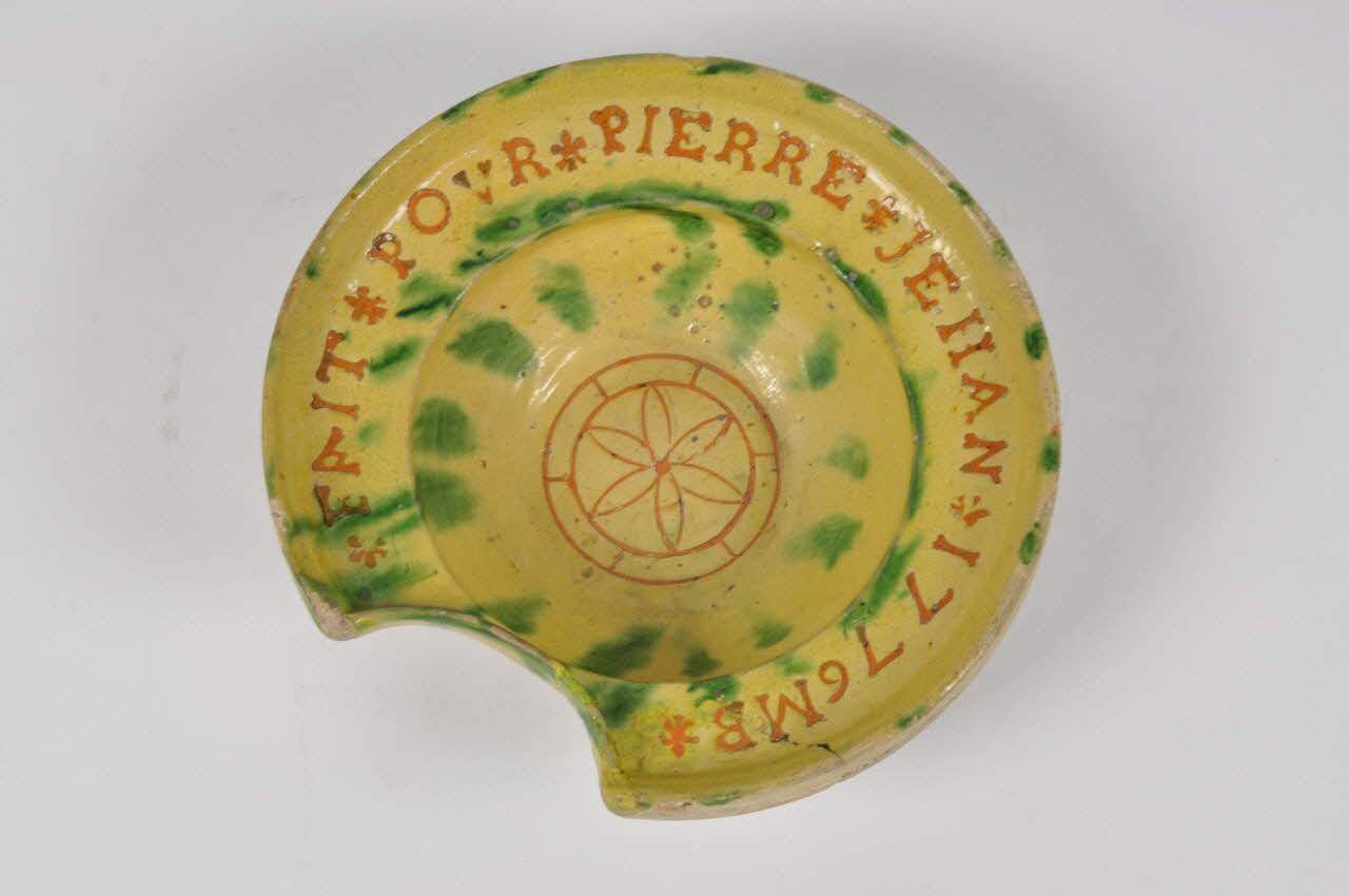 terre commune, au tour, tournasée, décor peint en jaune, vert, orange, émaillée / Sur plan circulaire, bords bas évasés, échancrure sur un côté. Au fond, un décor de rosace. Sur le Marli une inscription avec fleur de lys. Le tout sur un fond en émail jaune à glaçure transparente.