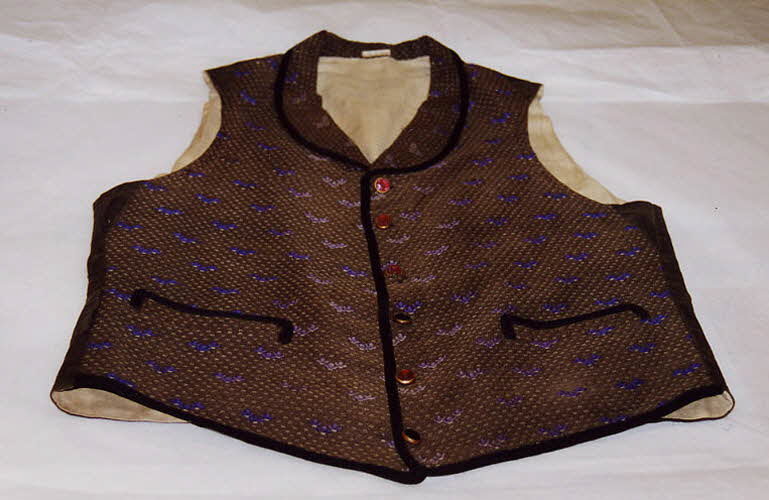 En toile de coton marron à armure complexe décorée de fleurs stylisées bleues sur le devant. Encolure pointue, col châle, sans manches. Deux poches sur le devant. Ouverture partant de l'encolure. Six boutonnières et boutons en laiton et verre rose transparent et moulés.