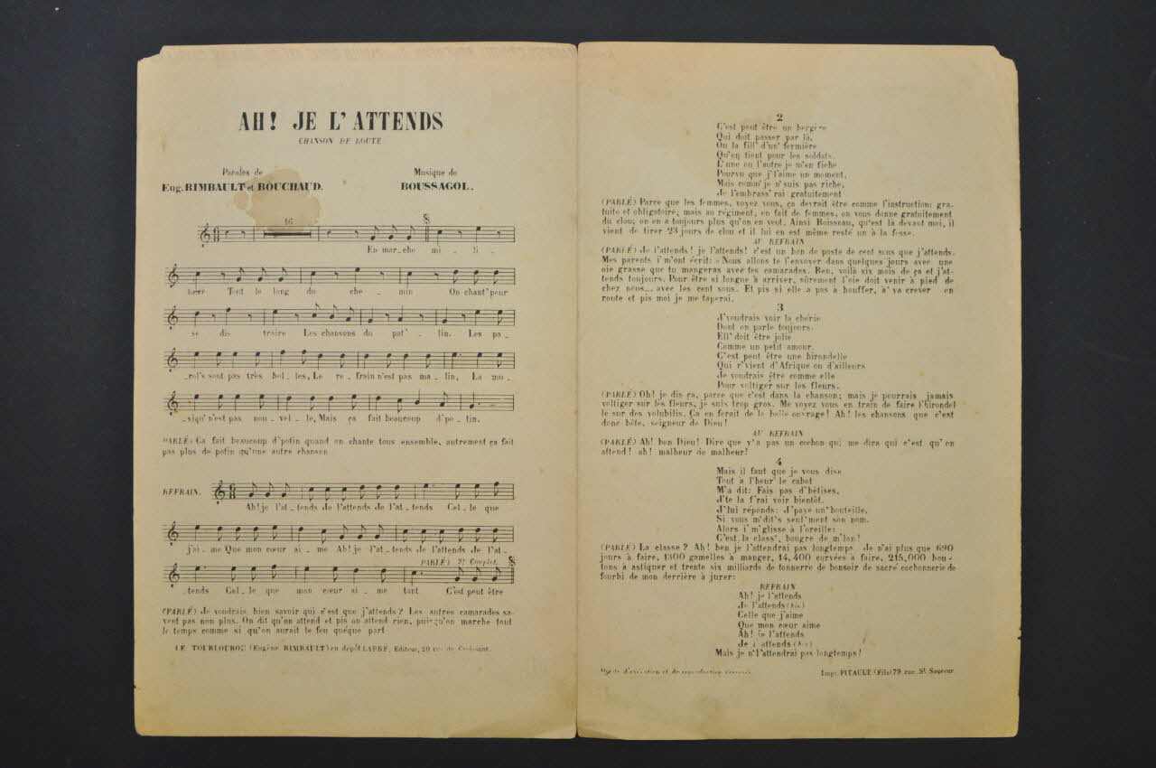A l'intérieur, partition sur le volet gauche et parole sur celui de droite. Le dos présente un catalogue de chansons militaires par les même auteurs, au même répertoire.Matériaux et techniques