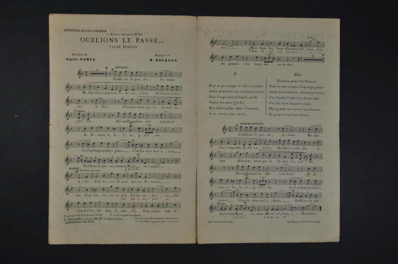 Les inscriptions renseignent le titre de la chanson, le nom des auteurs, de l'artiste et de l'éditeur. A l'intérieur, partitions et paroles de la chanson. Au dos, liste d?autres partitions publiées par l?éditeur.Décor