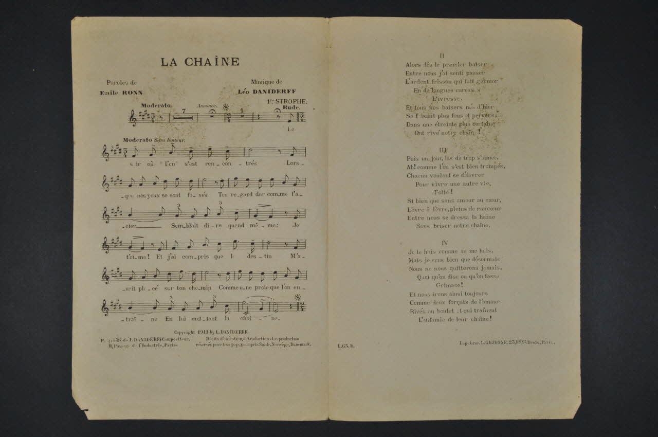 Des inscriptions renseignent le titre, les auteurs, les exécutants et l'éditeur. A l'intérieur, partition et paroles de la chanson. Au dos, un extrait d'une autre chanson.Décor