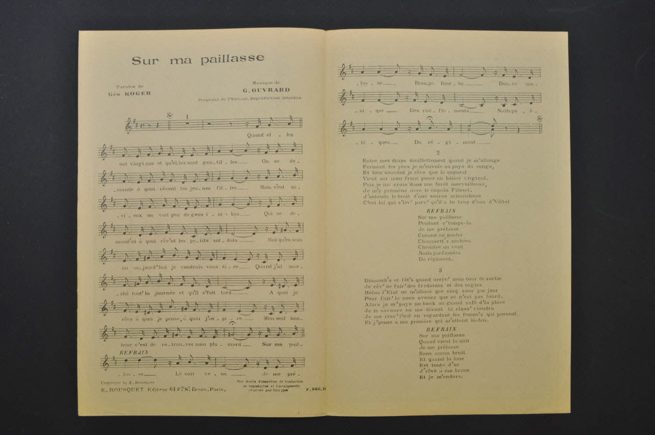 Feuillet rectangulaire en papier industriel imprimé à l'encre noire. L'intérieur présente les paroles et la partition de la chanson. Au dos, publicité pour l'éditeur.Matériaux et techniques