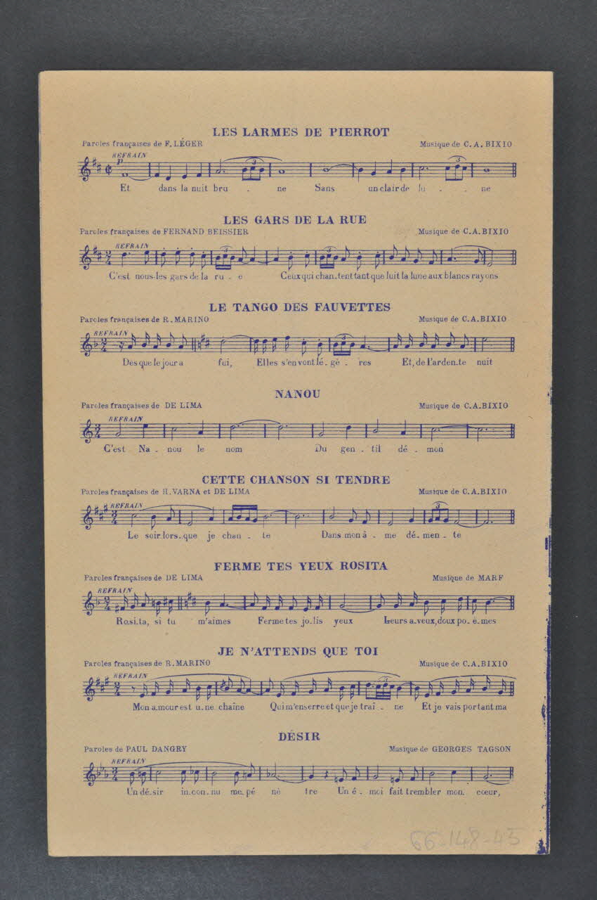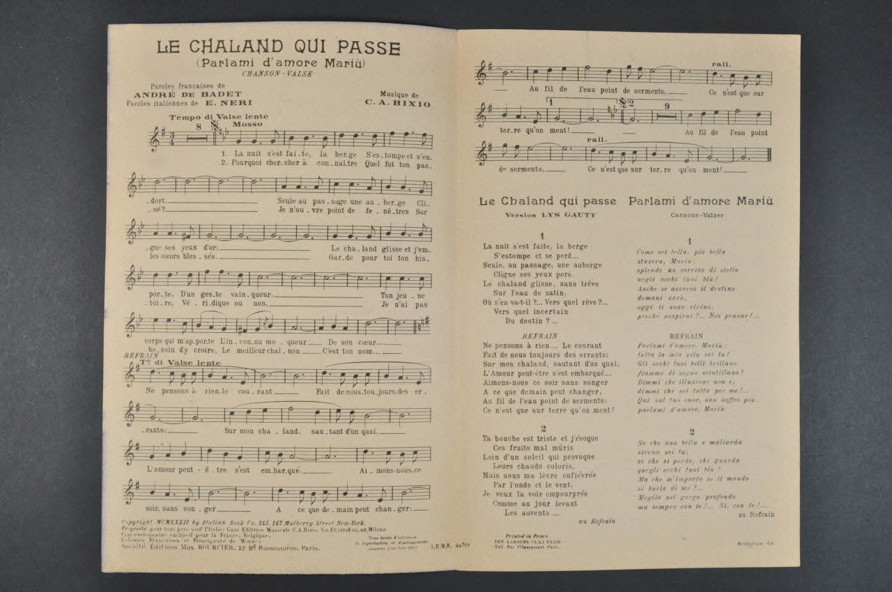 Des inscriptions renseignent le titre, les auteurs, les exécutants et l'éditeur. A l'intérieur, partition et paroles de la chanson. Au dos, liste d'autres partitions publiées par l'éditeur.Matériaux et techniques