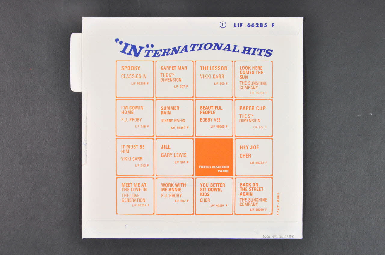 Sur le recto, figurent les noms du groupe en blanc sur fond bleu et des chansons en orange sur fond blanc. Sur le fond bleu, il y a une lune et des étoiles blanches. Une petite languette est présente sur le côté supérieur droit, avec le nom du groupe inscrit en orange. Le verso est composé d'inscriptions bleues et oranges sur fond blanc. Il présente les noms d'autres albums de la même maison d'édition dans des carrés oranges.Matériaux et techniques