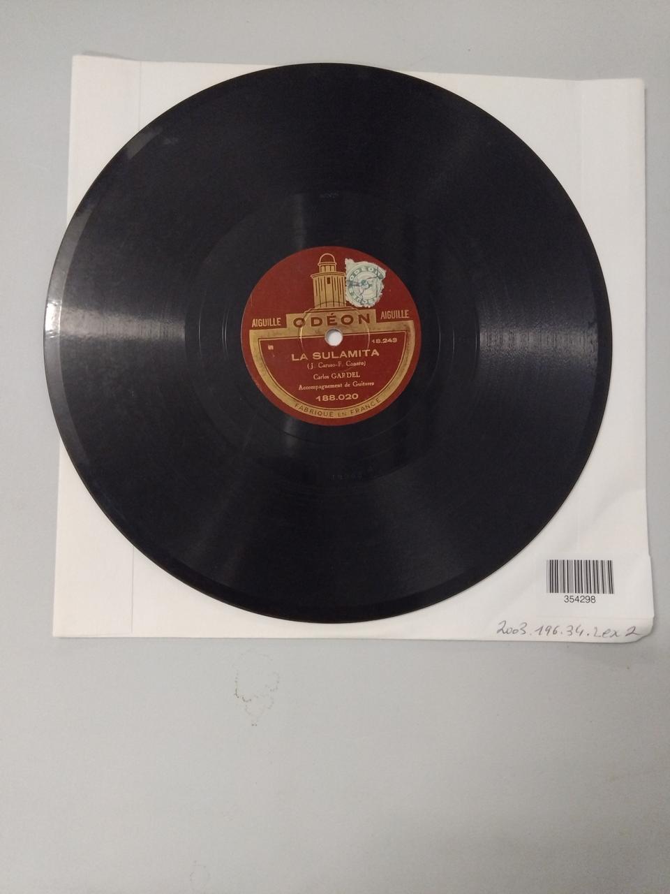 Le disque vinyle est composé en son centre, au recto et au verso d'une partie en papier rouge avec des inscriptions dorées. On y voit également en partie supérieure, le logo de la marque Odéon, un motif architectural à colonnes surmonté d'une rotonde.Matériaux et techniques