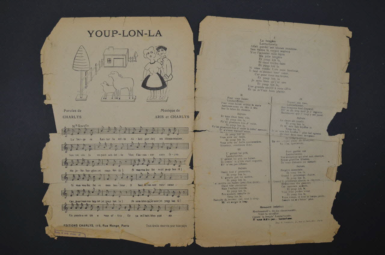 Des inscriptions renseignent le titre, les auteurs, les exécutants et l'éditeur. A l'intérieur, partition et paroles de la chanson, avec illustration d'un couple de berger, deux moutons et une maison. Au dos, liste d'autres partitions publiées par l'éditeur.Décor