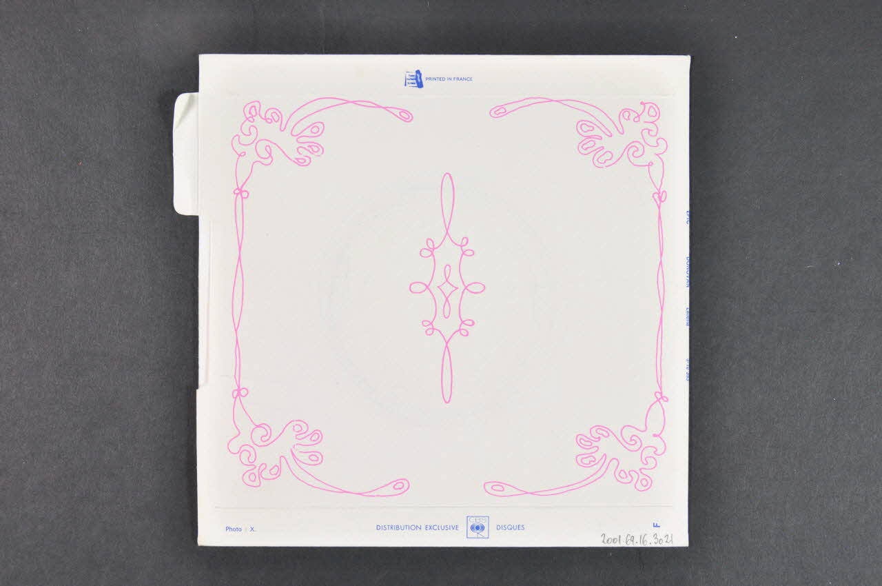 Pochette de disque de forme carrée, en papier plié et collé. Le recto présente du texte en rose sur fond blanc (nom de l'artiste, titres des morceaux...) dans les parties supérieure et inférieure ainsi que la photographie en bleu et blanc de l'interprète de profil au centre. Une languette dans la partie supérieure droite indique le nom de l'interprète. Le verso présente des motifs végétaux.Matériaux et techniques