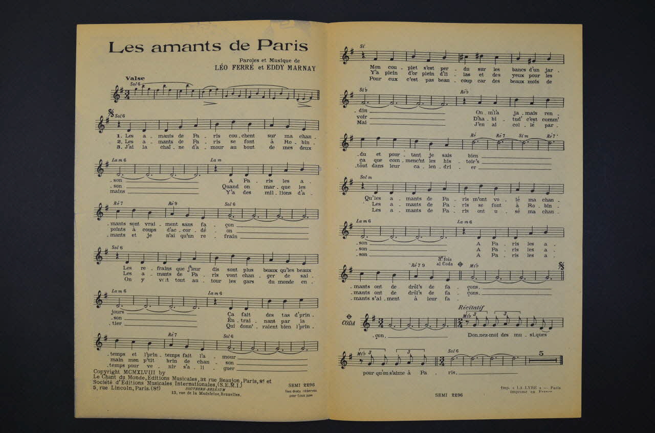 Les inscriptions précisent l'auteur de la chanson, les interprètes et l'éditeur du feuillet. L'intérieur comporte la partition et les paroles. Au dos, une liste d'autres titres disponibles chez le même éditeur.Matériaux et techniques