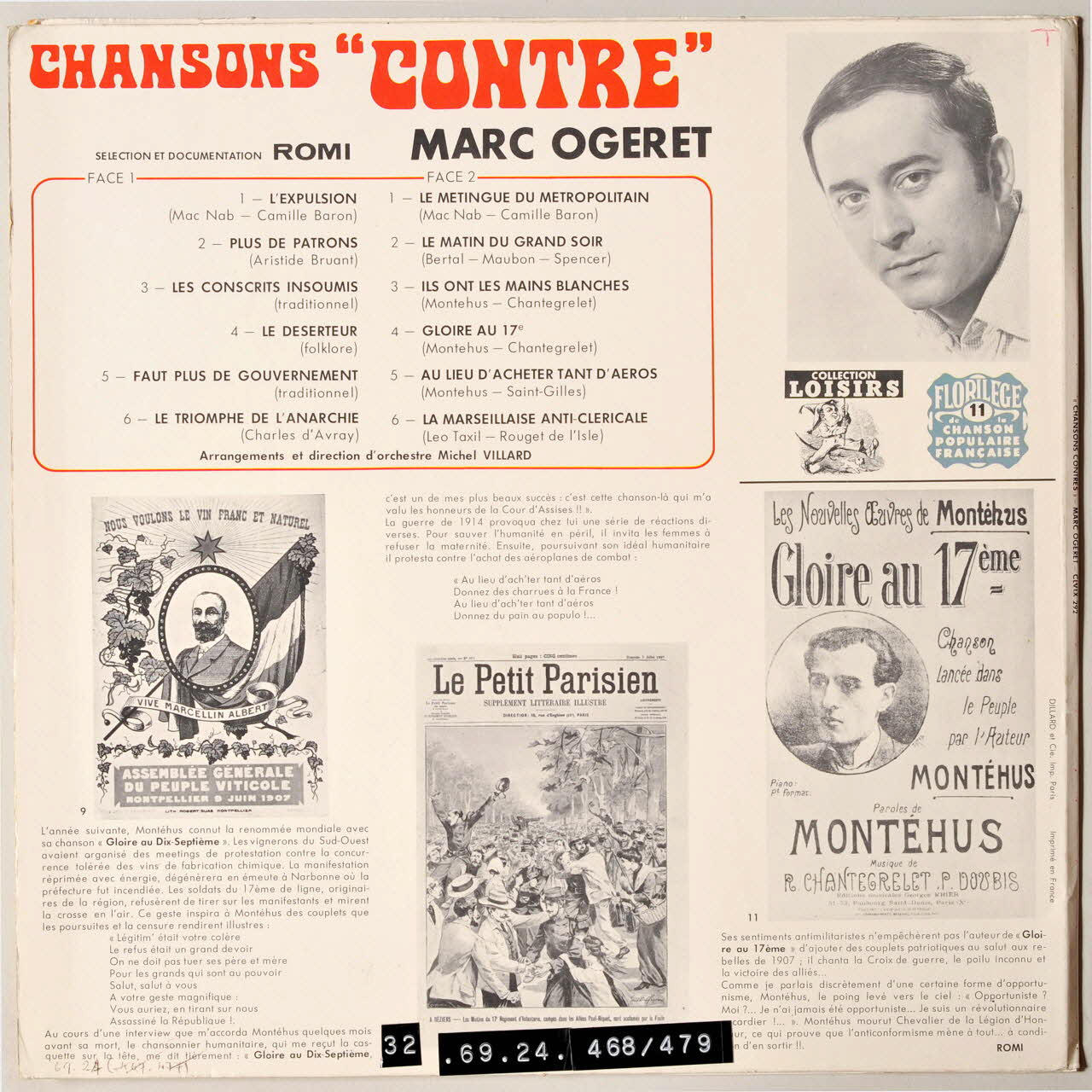 disque 33 tours, Le déserteur, Ils ont les mains blanches, L'expulsion, Faut plus de gouvernement, Le metingue du métropolitain, Gloire au 17ème, Chansons contre 1880-1914, La Marseillaise anticléricale, Le triomphe de l'anarchie, Plus de patron, Le matin du grand soir, Au lieu d'acheter tant d'aéros, Les conscrits insoumis