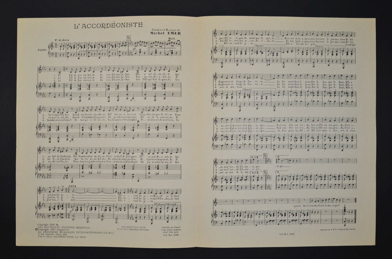 Les inscriptions précisent l'auteur de la chanson, les interprètes et l'éditeur du feuillet. L'intérieur comporte la partition et les paroles. Le dos est laissé vierge.Matériaux et techniques