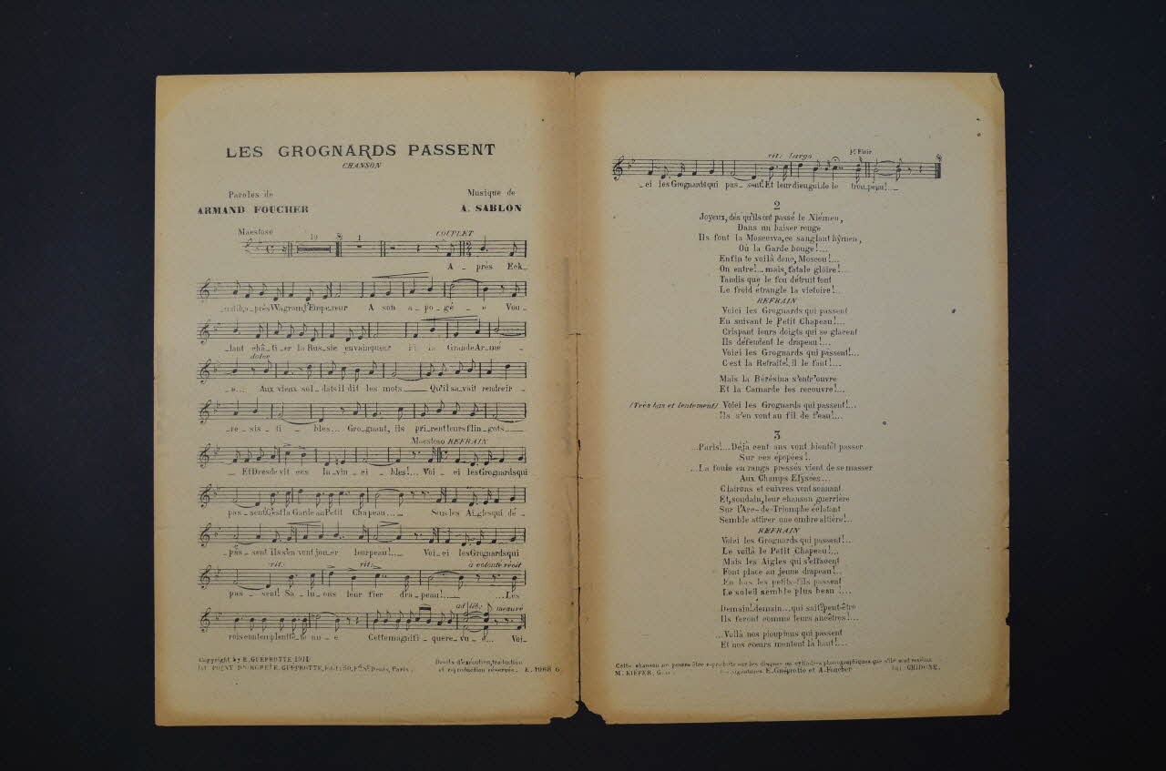 Feuillet rectangulaire en papier industriel imprimé. Le feuillet contient la partition et les paroles de la chanson. Au, dos, publicité pour l'éditeur.