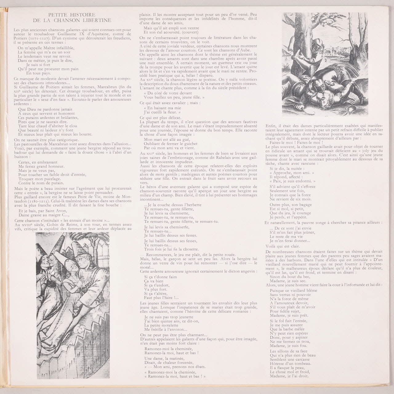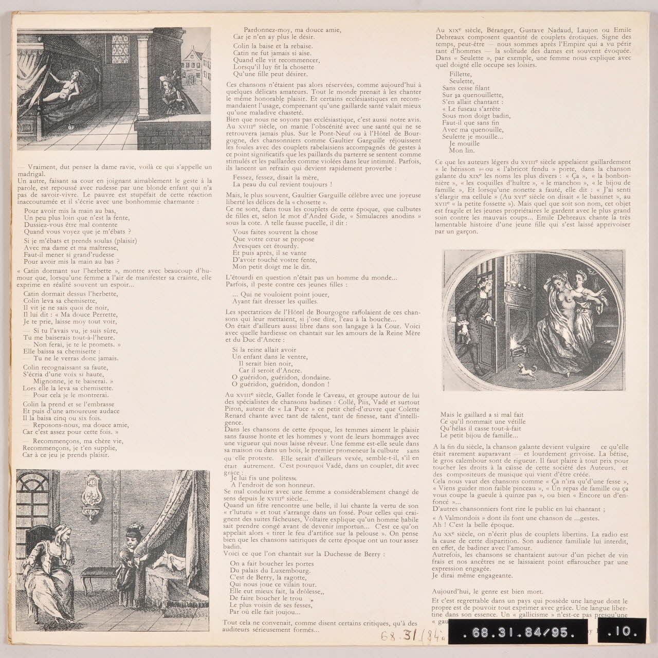 Des inscriptions sur les deux faces de la pochette et sur l'étiquette rose et blanche du disque renseignent les titres et les exécutants de l'album. Les paroles des chansons sont commentées au sein d'une "Petite Histoire de la chanson libertine", se déroulant sur l'intérieur de la pochette et sur le verso de celle-ci.Décor